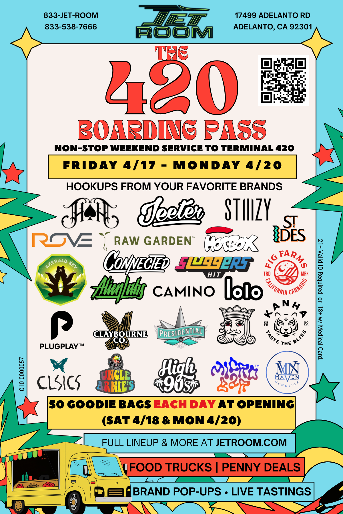 Get ready for takeoff! Our annual 420 Boarding Pass weekend is the ultimate High Desert celebration. From Friday, 4/17 through Monday, 4/20, we’re featuring exclusive hookups from your favorite brands like Jeeter, Stiiizy, and Raw Garden.