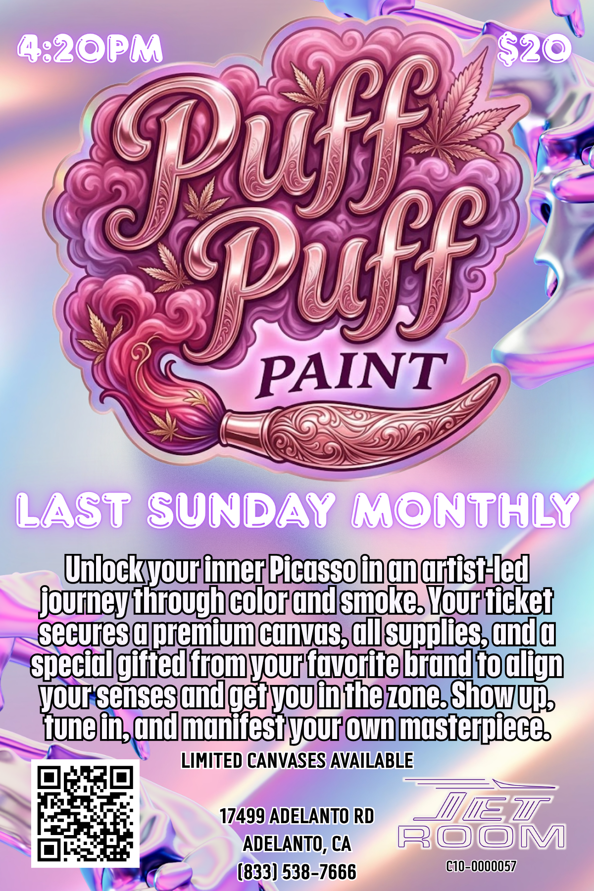 Unleash your creativity at our monthly Puff, Puff, Paint night—held every last Sunday at 4:20 PM. This artist-led journey invites you to explore color and smoke in a relaxed, social setting. Your $20 ticket secures a premium canvas and all the supplies you need, plus a special gift from a featured brand to help you get into the zone. Show up, tune in, and manifest your own masterpiece.