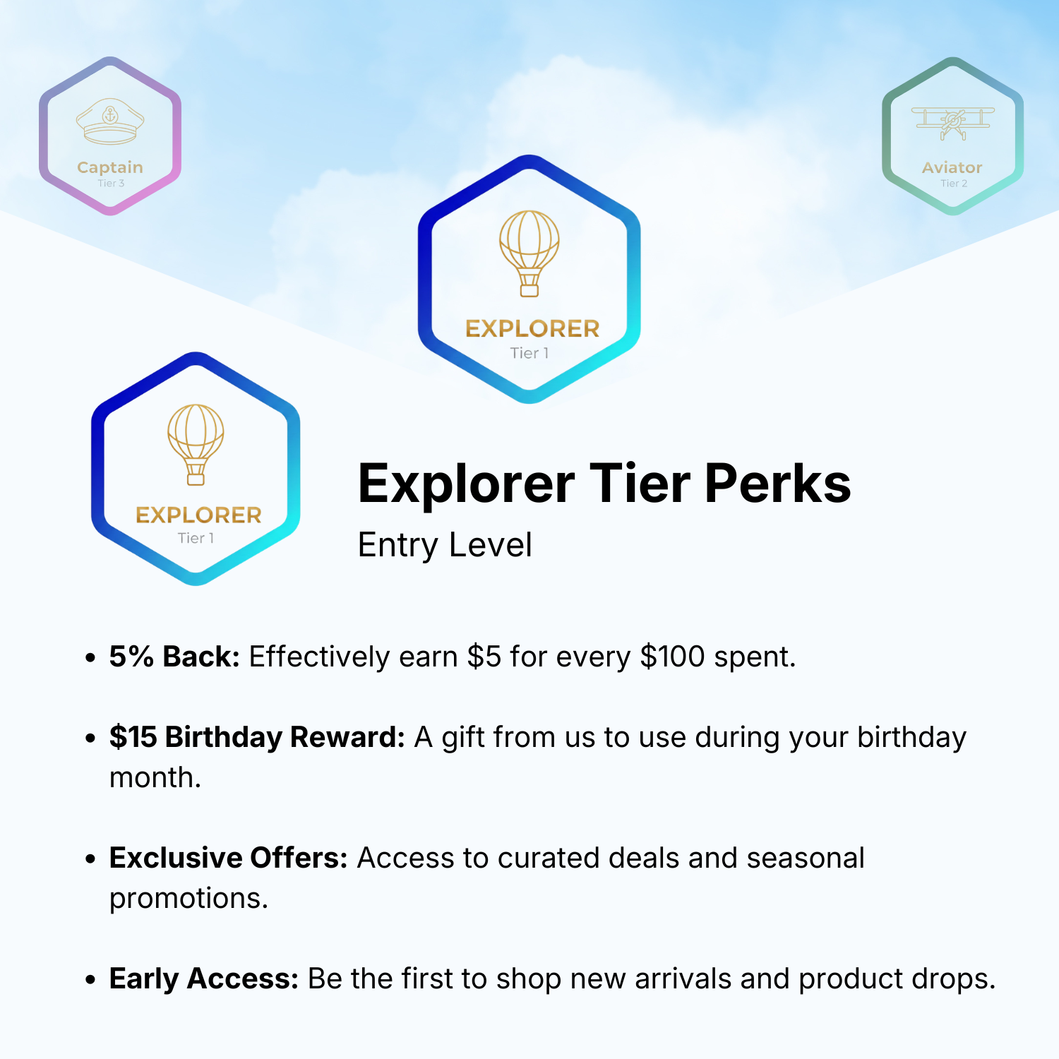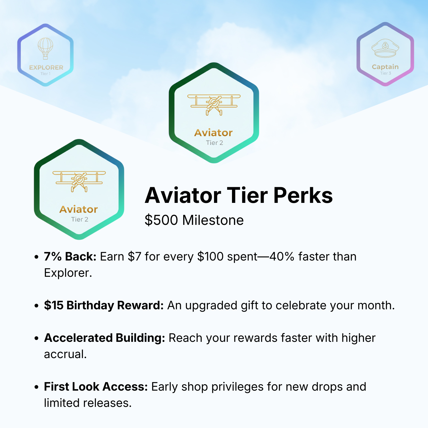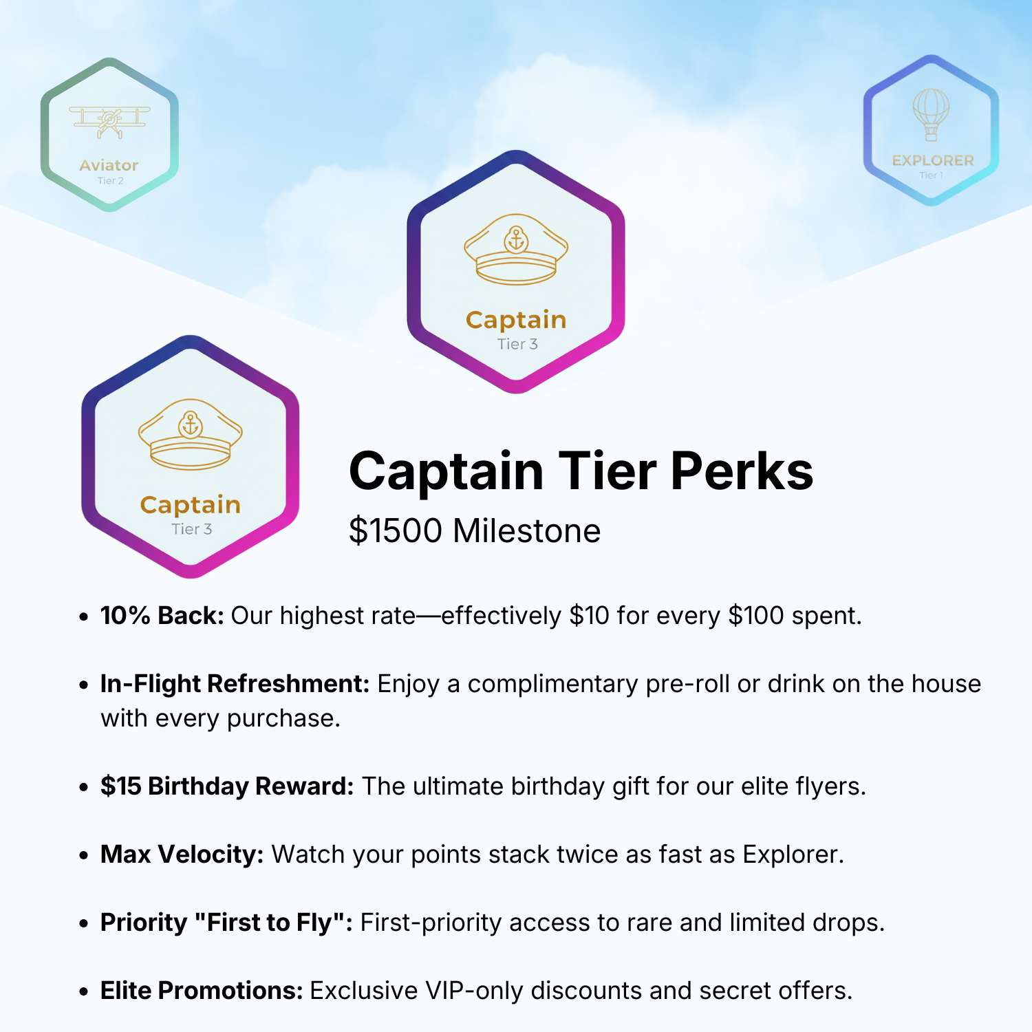Whether you’re visiting us in-store or using the Jet-Thru express lane, every dollar spent brings you closer to your next rank. Watch your status climb from Explorer to Aviator, and finally to Captain.
